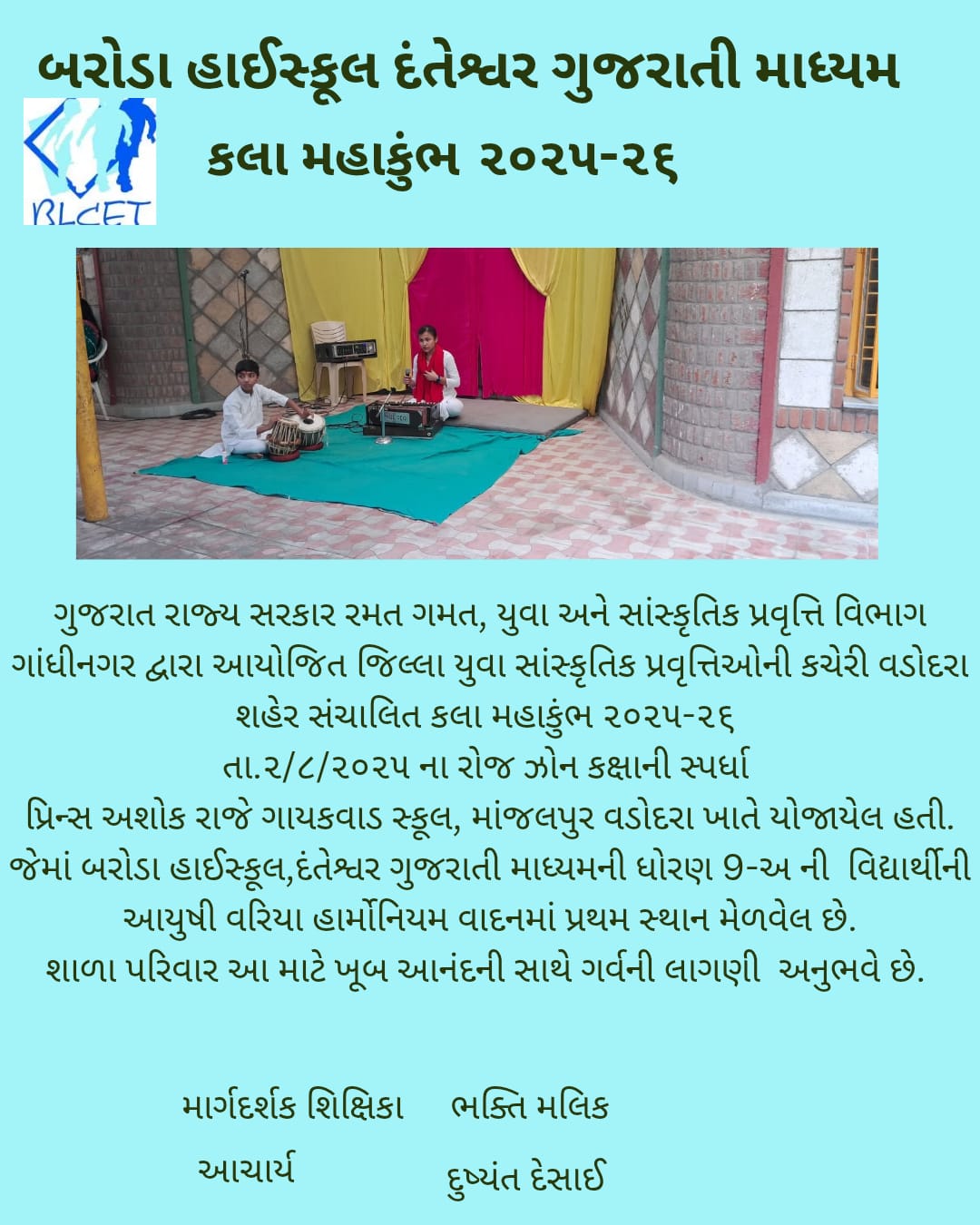 કલા મહાકુંભ ૨૦૨૫-૨૬ – ઝોન કક્ષાની સ્પર્ધા -હાર્મોનિયમ વાદનમાં પ્રથમ સ્થાન