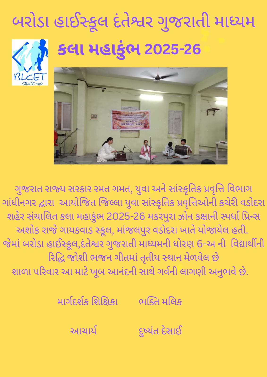 કલા મહાકુંભ – ૨૦૨૫-૨૬ ઝોન કક્ષાની સ્પર્ધામાં ભજન ગીતમાં તૃતીય સ્થાન