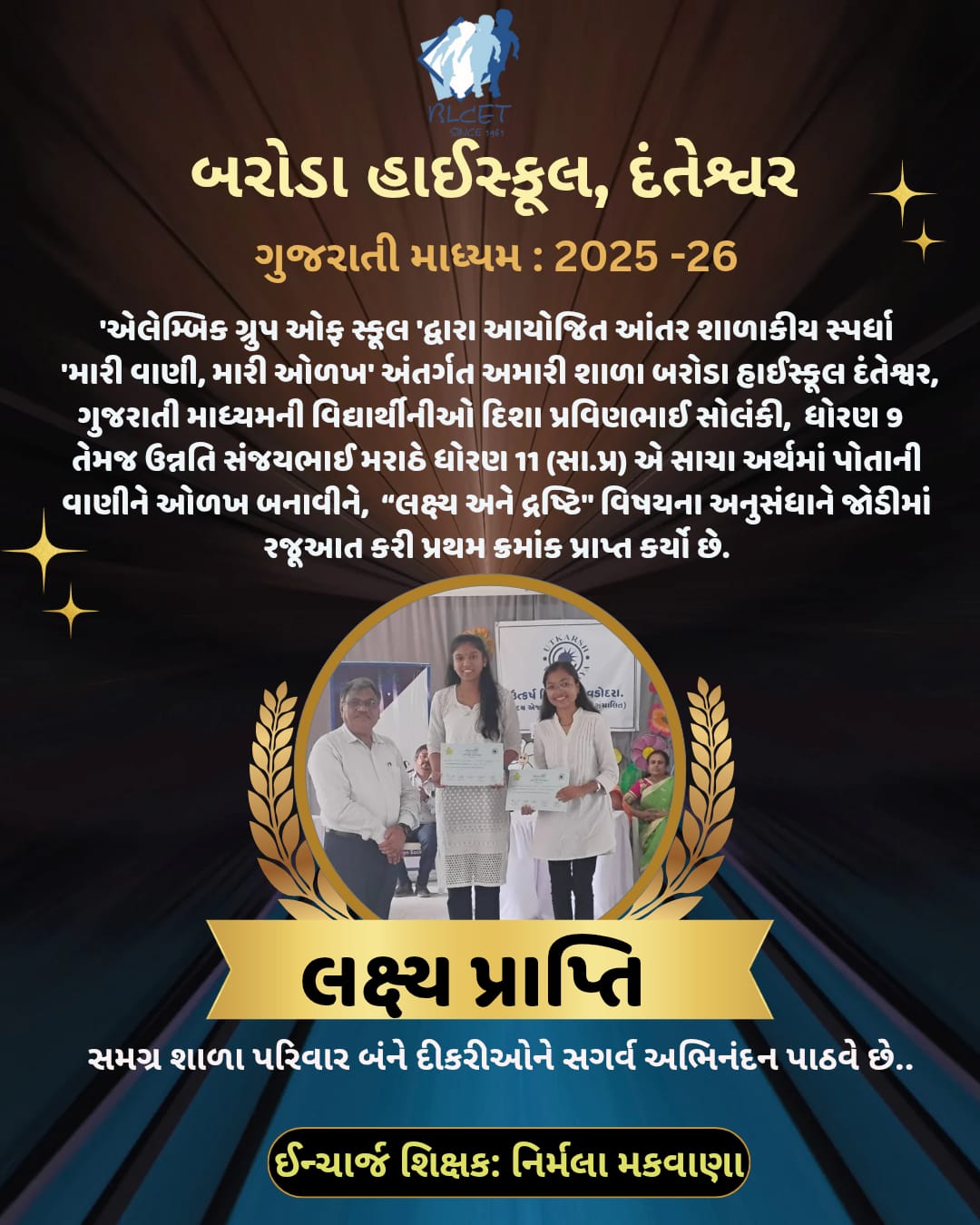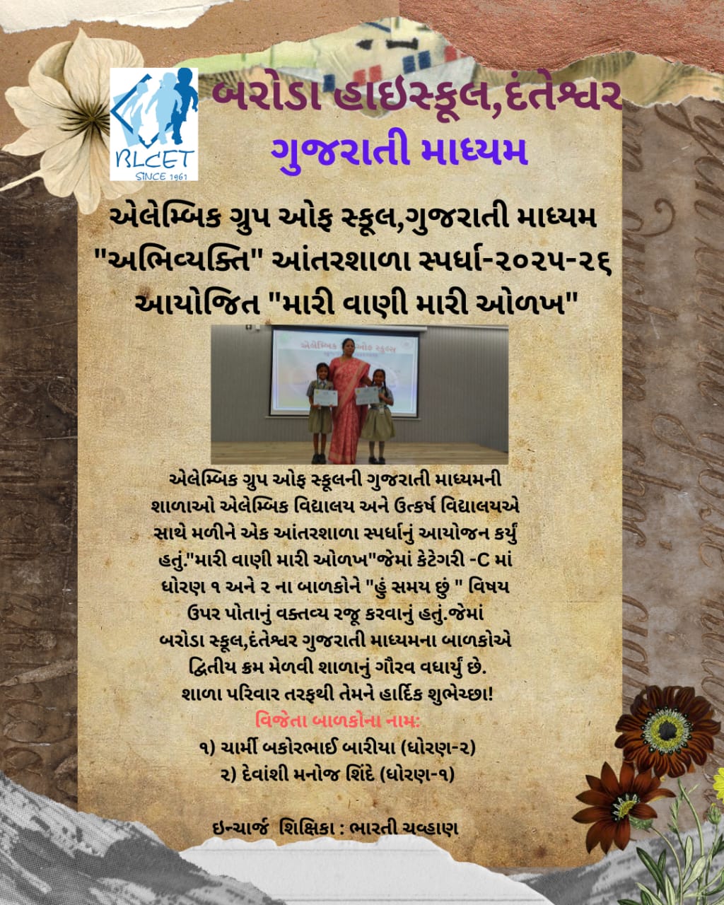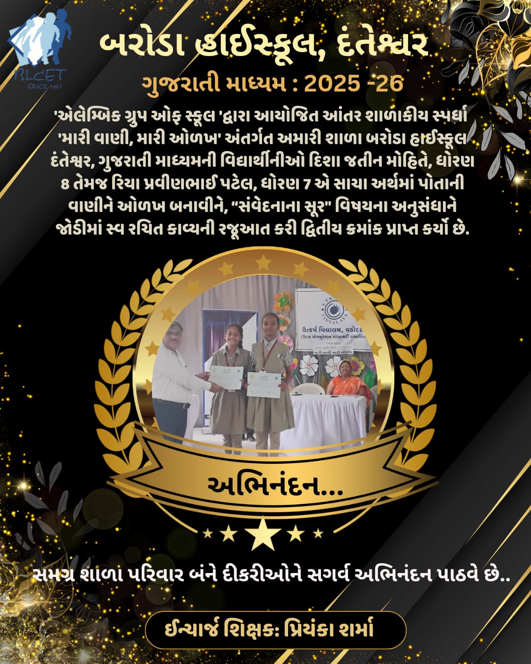 ૨૬/૧૨/૨૫ : જિલ્લા રમત ગમત યુવા અને સાંસ્કૃતિક વિભાગ વડોદરા દ્વારા જિલ્લા કક્ષા બાળ પ્રતિભા શોધ સ્પર્ધા ૨૦૨૫ ભજન સ્પર્ધામાં પ્રથમ ક્રમે વિજેતા