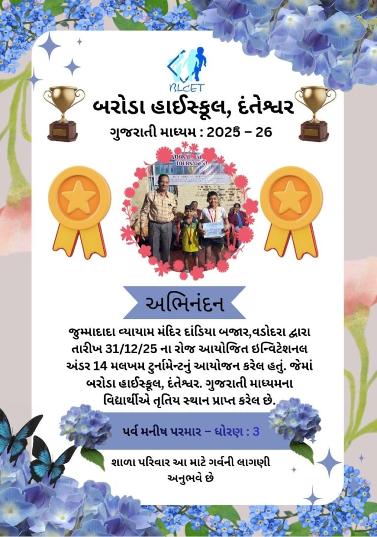 ૨૬/૧૨/૨૫ : જિલ્લા રમત ગમત યુવા અને સાંસ્કૃતિક વિભાગ વડોદરા દ્વારા જિલ્લા કક્ષા બાળ પ્રતિભા શોધ સ્પર્ધા ૨૦૨૫ ભજન સ્પર્ધામાં પ્રથમ ક્રમે વિજેતા